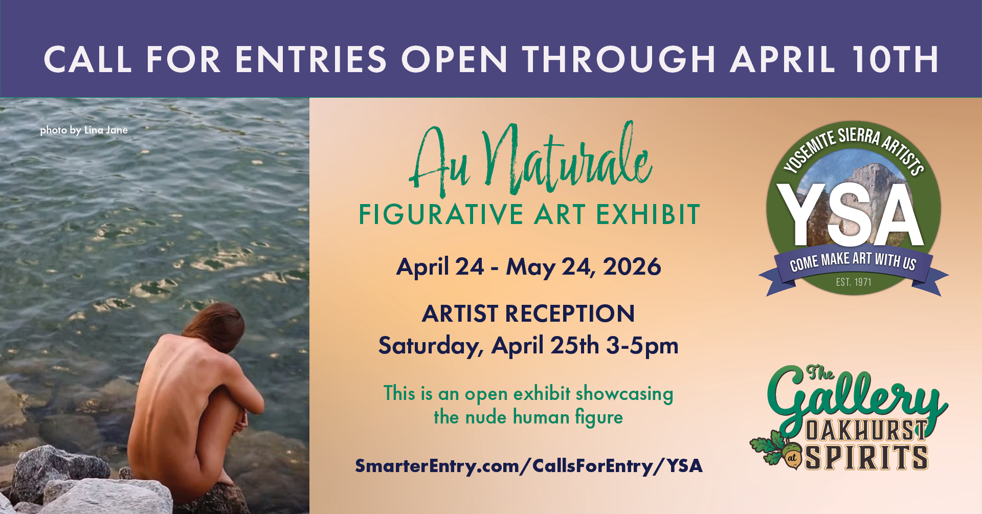 - Submit art to SmarterEntry.com/CallsForEntry/YSA by April 10, 2026 by midnight Please post your favorite image first in Smarter Entry. Artists will receive notification of works accepted by email on April 15. Make sure that emails from YosemiteSierraArtists.org are being accepted by your email provider. Oakhurst Spirits Gallery has limited space so it’s possible not all art will be accepted.