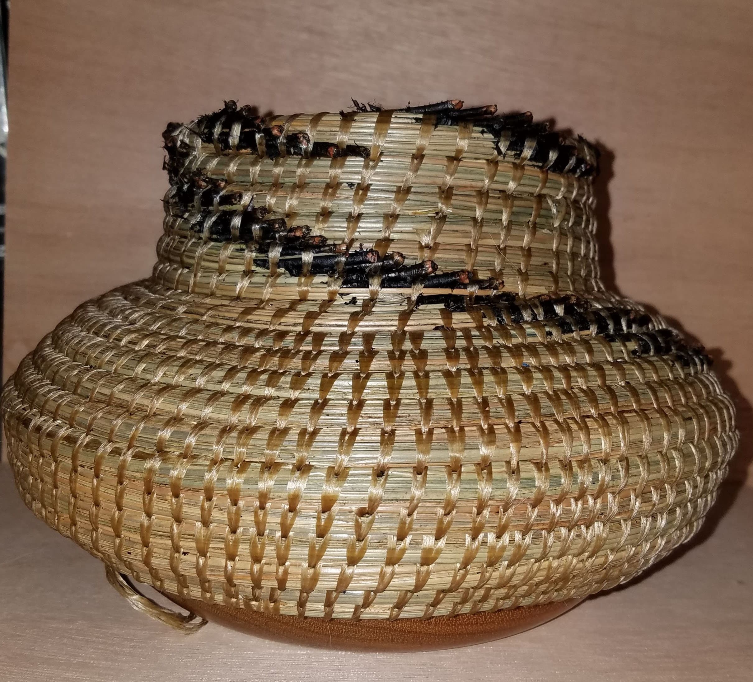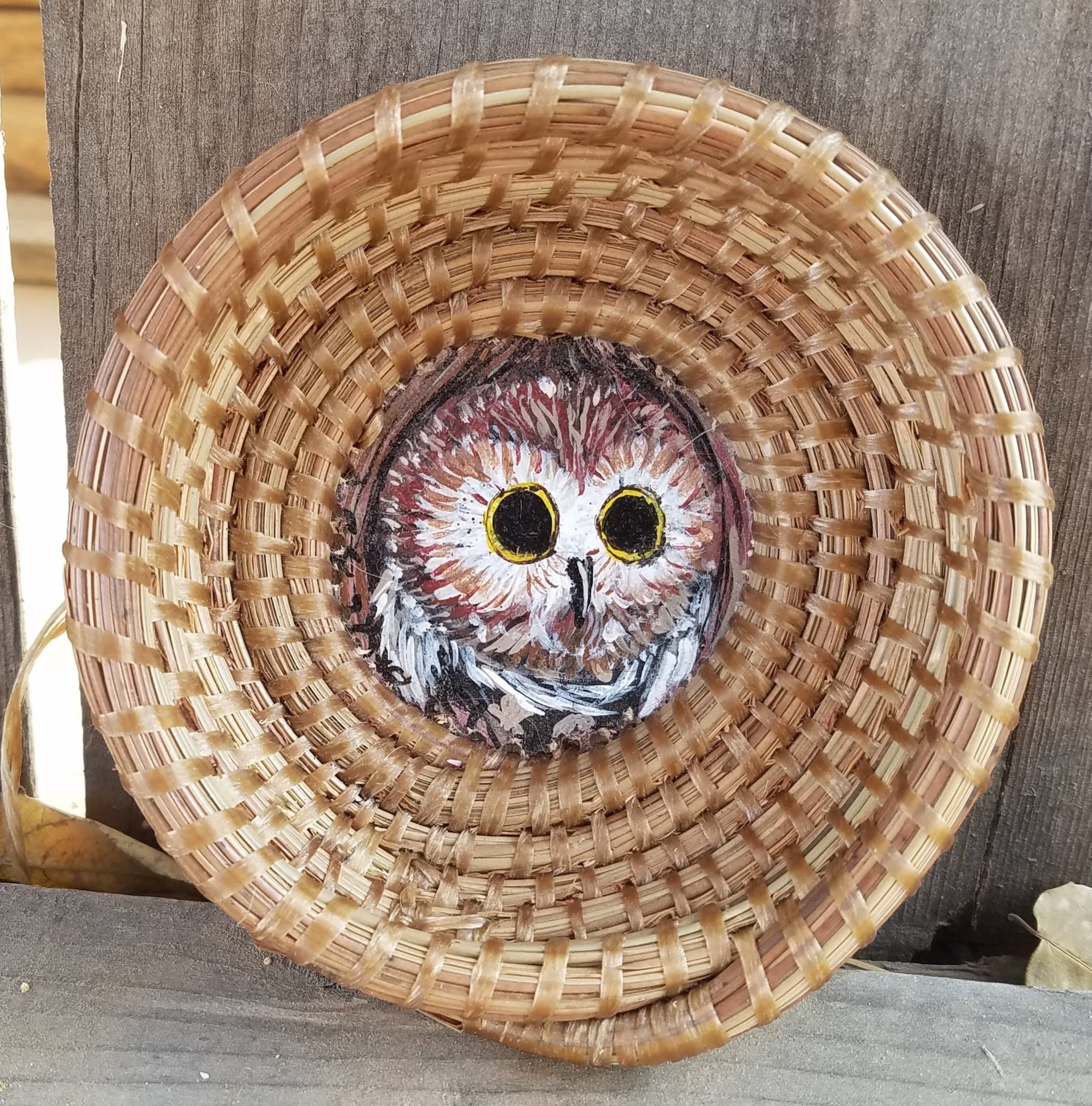 Now I concentrate on Acrylic Paintings, and Pine Needle Baskets. I prefer the pine needle baskets and items that I have painted on various pieces of barnwood and gourds. I like the pine needle baskets as the raw materials speak to me and I can pick them up locally as well as at the coast. The only items I buy for my baskets are the stone beads, metal beads, arrowheads, and the sinew type thread, everything else is provided by nature. My Acrylic Paintings on Barnwood are unique and really speak to the artist in me with the great texture that is achieved with the paint on the Barnwood.